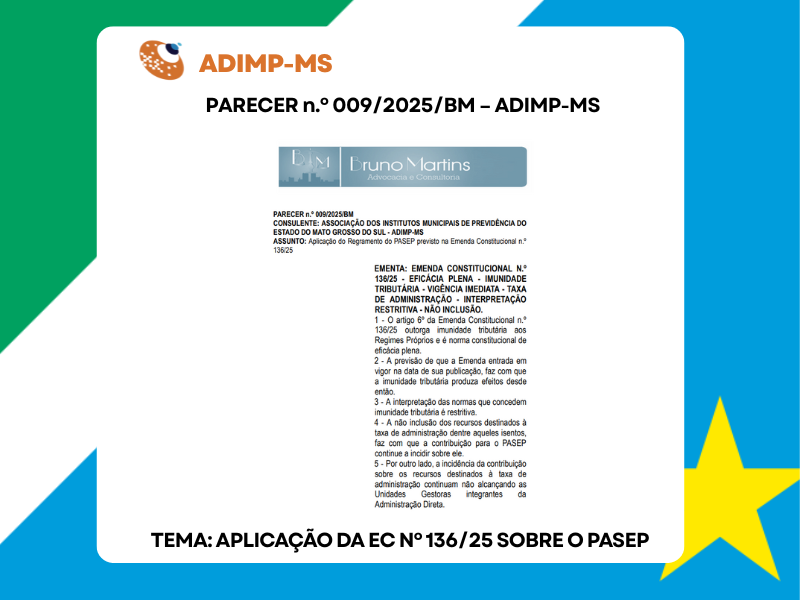 A Associação dos Institutos Municipais de Previdência do Estado do Mato Grosso do Sul (ADIMP-MS) obteve parecer do consultor jurídico Bruno Sá Freire Martins acerca da aplicação da Emenda Constitucional nº 136/2025, especialmente no que se refere ao regramento do PASEP.