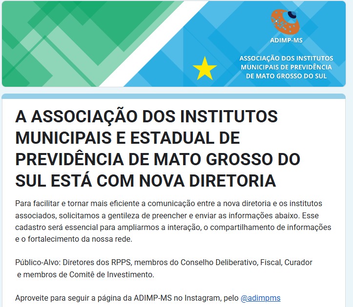 Para facilitar e tornar mais eficiente a comunicação entre a ADIMP-MS, RPPS’s e órgãos deliberativos, consultivos e comitês a ADIMP-MS solicita aos representantes que preencham formulário com informações pessoais.