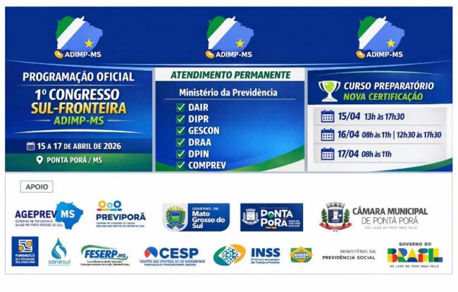 🎓 INSCRIÇÕES ABERTAS CURSO DE QUALIFICAÇÃO 📢 Curso de Qualificação 1º Congresso Sul-Fronteira – ADIMP-MS 📍 Garanta sua vaga e participe da capacitação voltada aos RPPS 🗓️ Evento: 15 a 17 de abril de 2026 📌 Local: Ponta Porã – MS 👉 Faça sua inscrição agora🔗 💡 O congresso reunirá gestores, conselheiros e especialistas de…