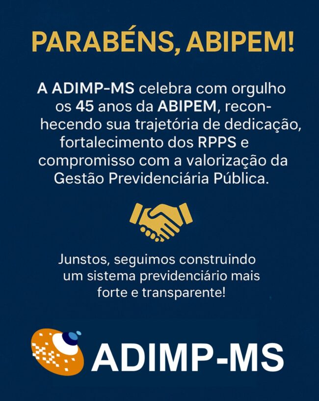 Parabéns, ABIPEM! A ADIMP-MS celebra com orgulho os 45 anos da ABIPEM, reconhecendo sua trajetória de dedicação, fortalecimento dos RPPS e compromisso com a valorização da Gestão Previdenciária Pública. 🤝 Juntos, seguimos construindo um sistema previdenciário mais forte e transparente! 📆 45 anos de história, compromisso e conquistas.