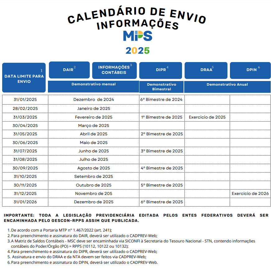 O Calendário de Envio de Informações, referente ao exercício de 2025, já está disponível. Esse documento é essencial para o cumprimento das obrigações previstas pelos Regimes Próprios de Previdência Social (RPPS) e para garantir o cumprimento dos prazos estabelecidos.